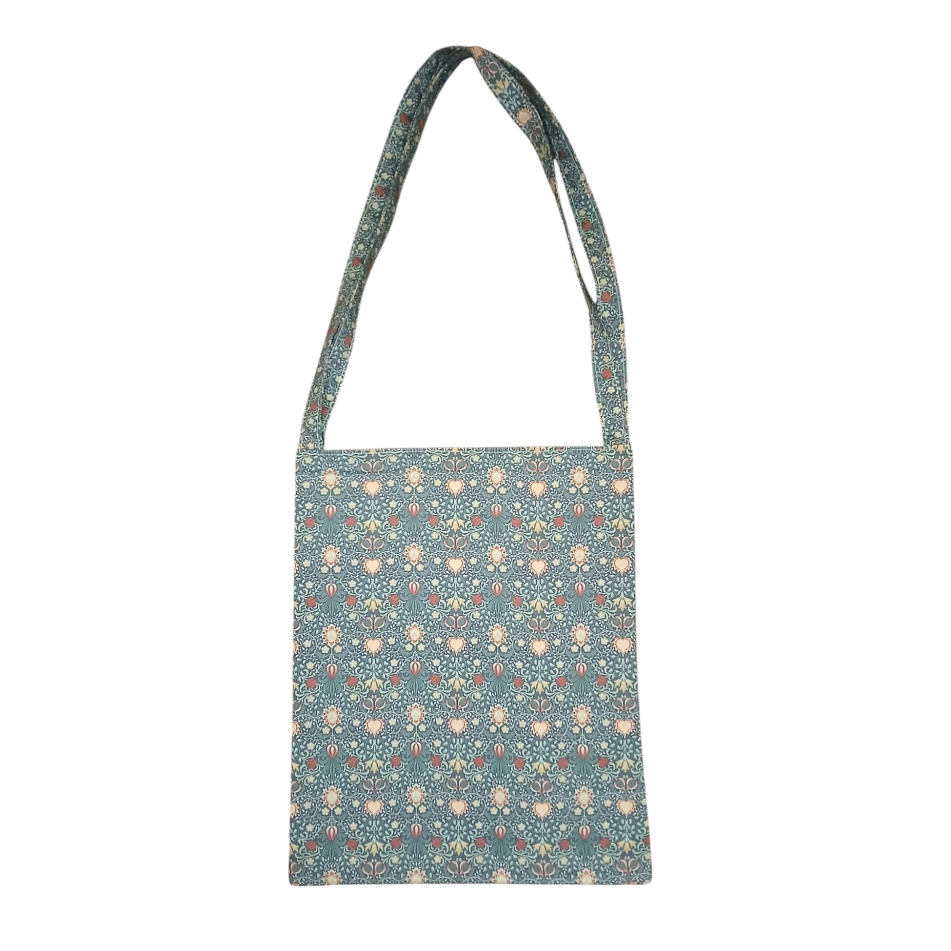 This lined tote bag is entirely made from recycled fabric. Measuring 16 inches long and 13.5 inches wide.