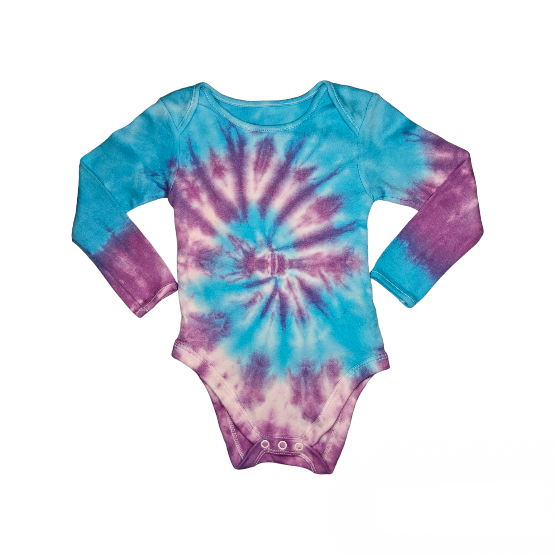 A 100% cotton long sleeve baby grow that's been liquid dyed in purple and blue.
