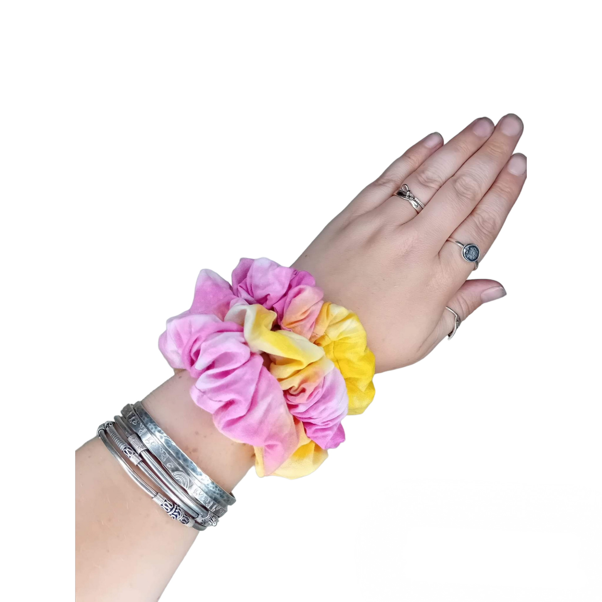 Made using recycled fabric saved from landfill, these scrunchies have been hand tied, dyed and sewn by me.